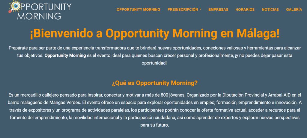 Es un mercadillo callejero pensado para inspirar, conectar y motivar a más de 800 jóvenes. Organizado por la Diputación Provincial y Arrabal-AID en el barrio malagueño de Mangas Verdes. El evento ofrece un espacio para explorar oportunidades en empleo, formación, emprendimiento e innovación. A través de expositores y un programa de actividades paralelas, los participantes podrán conocer la oferta formativa actual, acceder a recursos para el fomento del emprendimiento, la movilidad internacional y la participación ciudadana, así como aprender de expertos y explorar nuevas perspectivas para su futuro.
